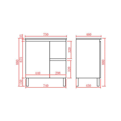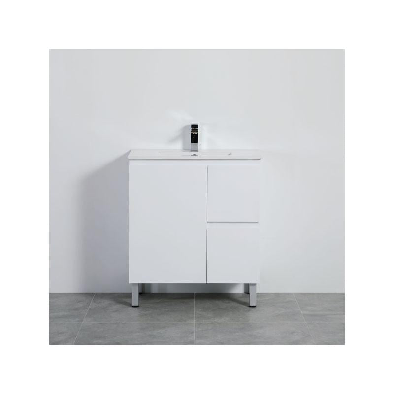 Bathroom Freestanding Right Hand Drawer White Polyurethane PVC Vanity With Ceramic Top 750x460x880mm